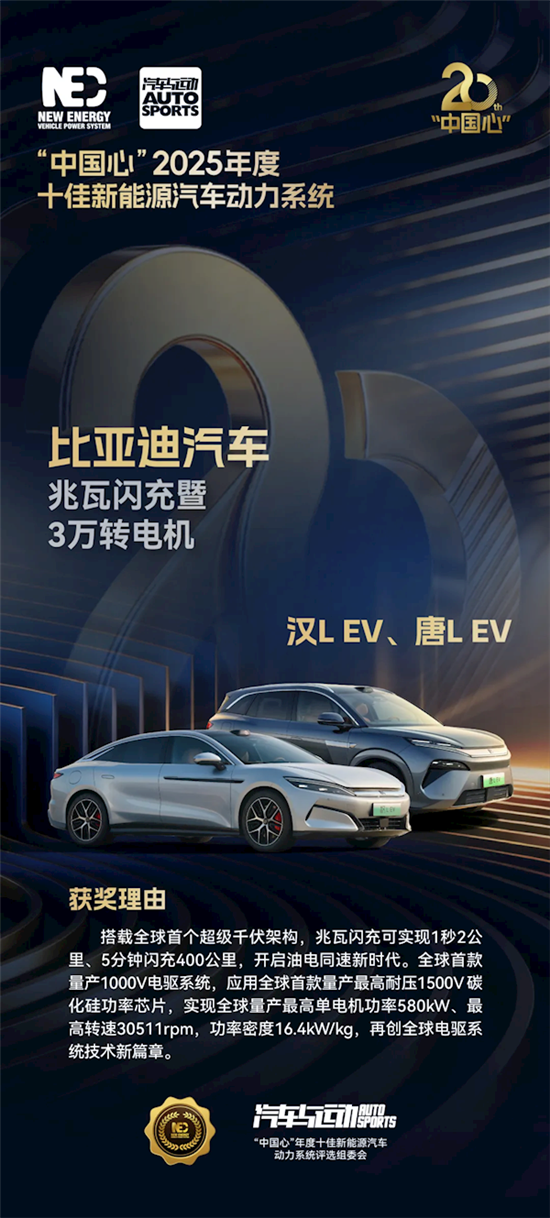 在2025年度“中国心”十佳新能源汽车动力系统评选中,比亚迪兆瓦闪充技术与三万转高速驱动电机双双入选。