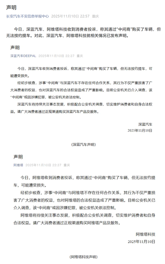 对此,深蓝汽车、阿维塔科技就相关情况已发布声明。