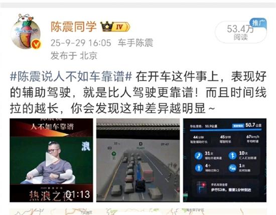 汽车博主陈震就辅助驾驶相关话题再次发声。
