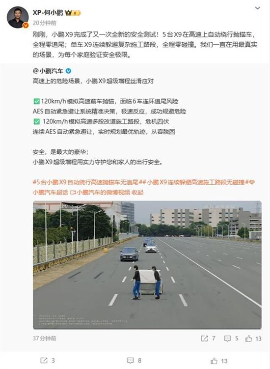 何小鹏宣布,小鹏X9完成两项全新安全测试,以真实高速危险场景验证车辆安全性能。