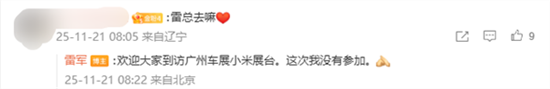 小米CEO雷军在回复网友评论时表示:“欢迎大家到访广州车展小米展台。这次我没有参加。”