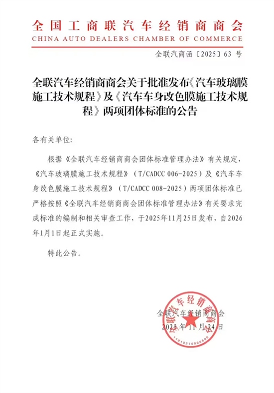 全联汽车经销商商会今日公告,依据《全联汽车经销商商会团体标准管理办法》,《汽车玻璃膜施工技术规程》(T/CADCC006-2025)与《汽车车身改色膜施工技术规程》(T/CADCC008-2025)两项团体标准已完成编制及审查,将于2025年11月25日发布,2026 年1月1日正式实施。