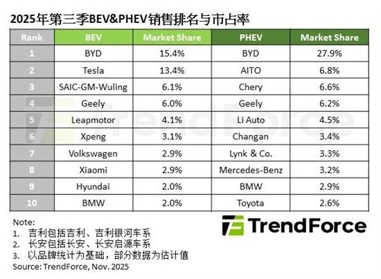 TrendForce集邦咨询发布的2025年第三季度全球新能源车销量报告。