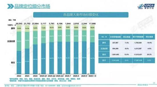 乘联分会数据显示,2025年前三季度,传统豪华品牌份额累计销量178.3万辆,较去年同期下降10.9%。不仅如此,豪华品牌的市场份额也在持续下滑,目前只占到整个市场的10.5%。曾经占据中国豪华车市场份额近八成的传统德系三强,如今的市场份额已经萎缩到不到四成。