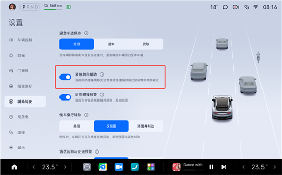 不过,在OTA升级后,AES“紧急转向辅助功能”默认为关闭状态,需您在车机中手动开启该功能。