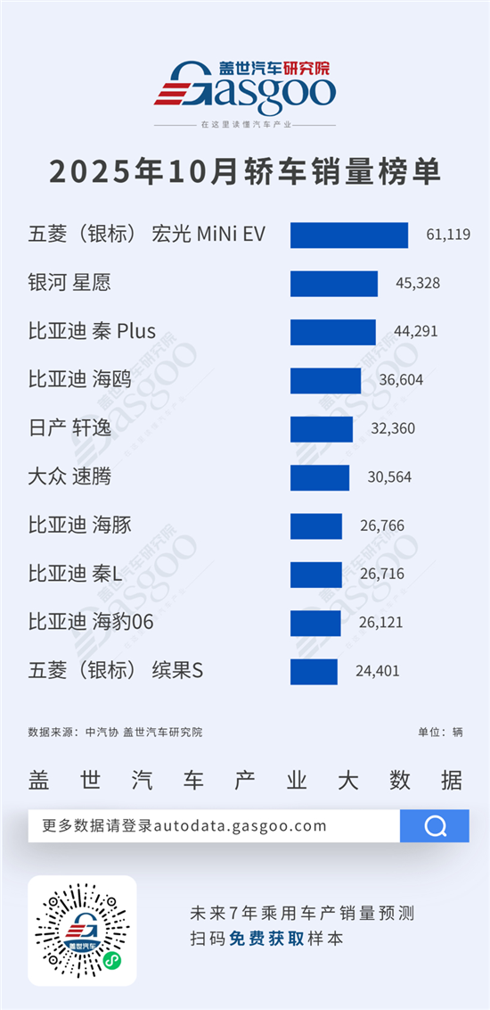 NO.1 五菱(银标)宏光 MiNi EV,10月销量61,119辆