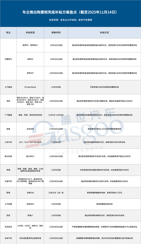 对此,车企有所预期。为让消费者安心购车,约20家车企在10月下旬至11月密集发布了购置税兜底补贴方案,包括鸿蒙智行、上汽奥迪、领克、广汽集团、极氪、小米汽车等品牌,涵盖传统自主、合资品牌和新势力。