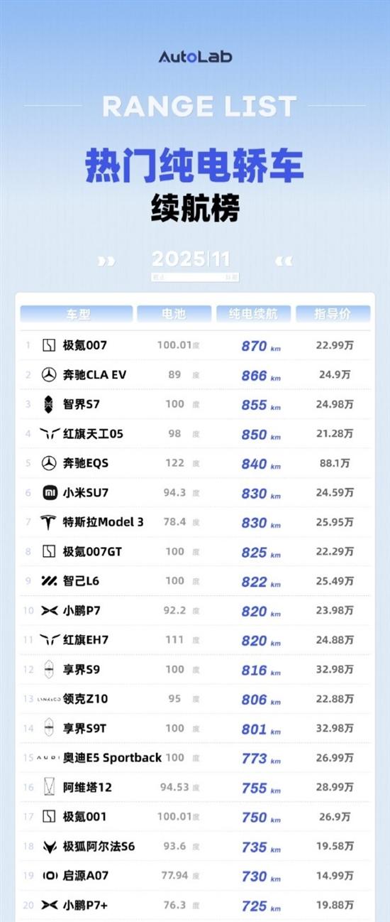 第6至10名中,小米SU7(830km,94.3度电池,24.59万元)、特斯拉Model 3(830km,78.4度电池,25.95万元)两款人气车型并列;极氪007GT(825km,100度电池,22.29万元)、智己L6(822km,100度电池,25.49万元)分列第八、九位;小鹏P7以820km续航(92.2度电池,23.98万元)进入前十。