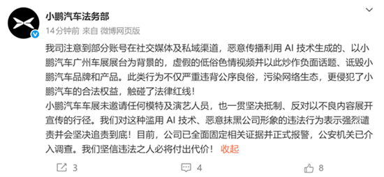 小鹏汽车法务部发文称,我司注意到部分账号在社交媒体及私域渠道,恶意传播利用AI技术生成的、以小鹏汽车广州车展展台为背景的,虚假的低俗色情视频并以此炒作负面话题、诋毁小鹏汽车品牌和产品。