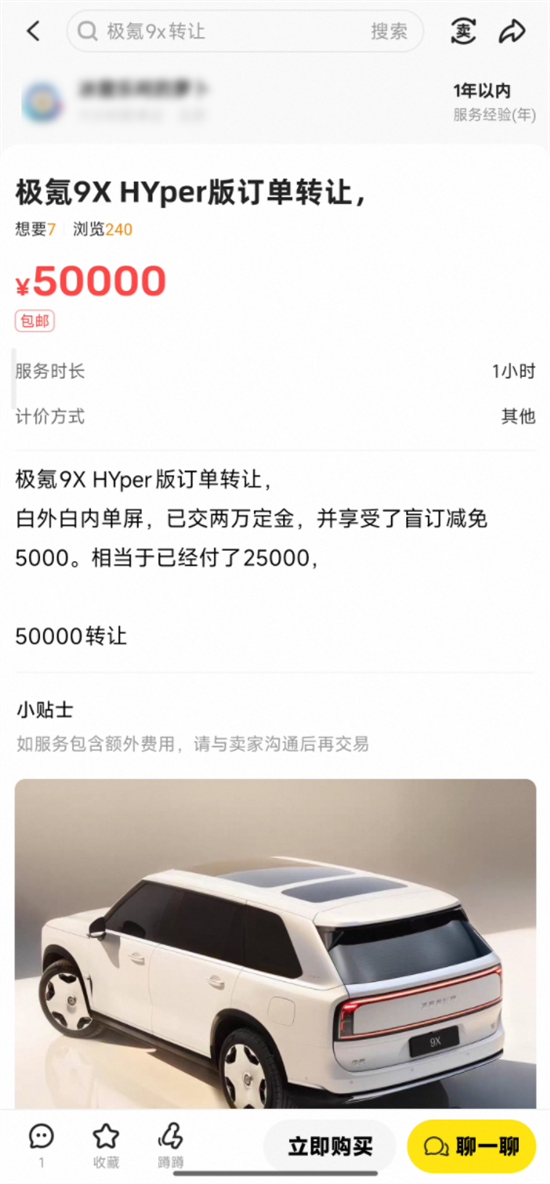 在二手平台闲鱼上,也有大量极氪9X转让Hyper版的订单,根据提车日期不同,加价额度也不同。