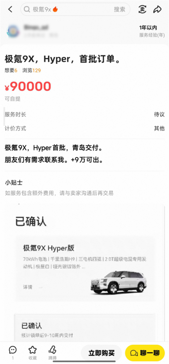 有卖家发布的帖子显示,目前已到店的个人户极氪9X Hyper版,订单转让价格从5万到9万元不等。