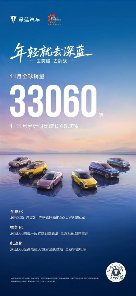 刚刚,深蓝汽车公布11月销量,深蓝汽车11月全球销量达33060辆,连续三月破3万,1-11月累计同比增长45.7%。
