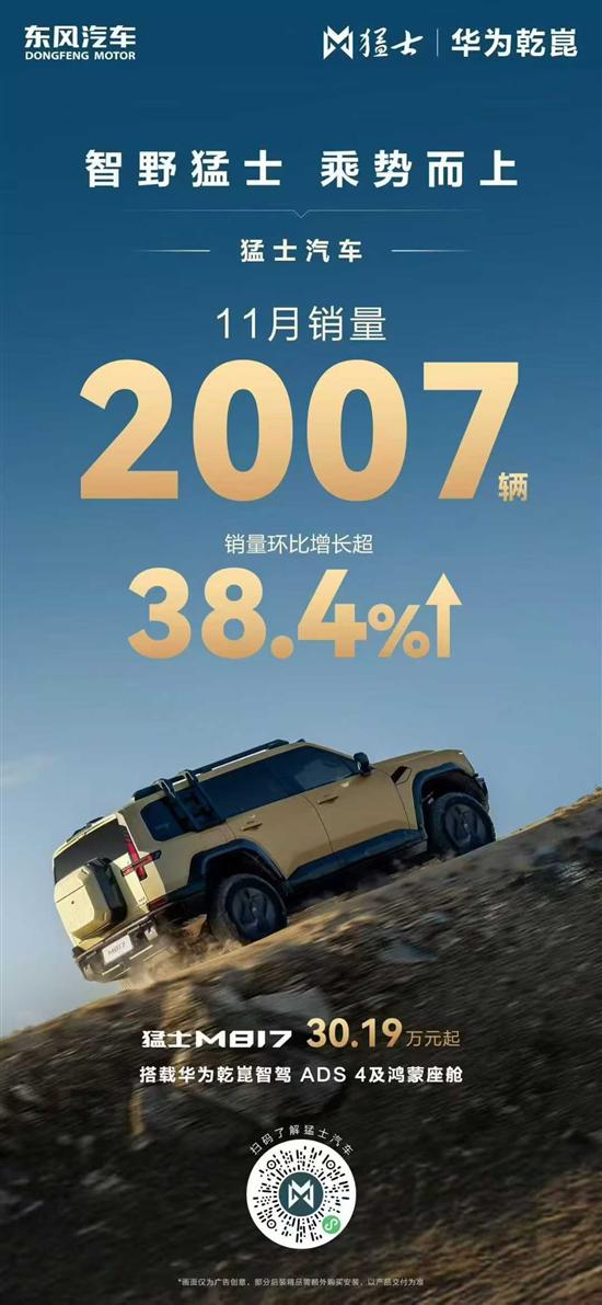 猛士汽车发布的销量数据现实,11月单月,猛士售车2007辆,环比增长超38.4%。