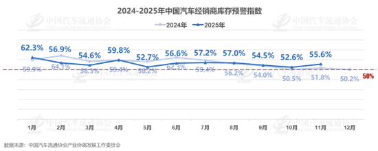 11月30日,中国汽车流通协会发布的最新一期“中国汽车经销商库存预警指数调查”显示,11月中国汽车经销商库存预警指数为55.6%,较去年同期上升3.8个百分点,较上月环比上升3.0个百分点。该指数连续位于50%的荣枯线之上,表明汽车流通行业仍处于不景气区间,行业压力较此前月份进一步加大。
