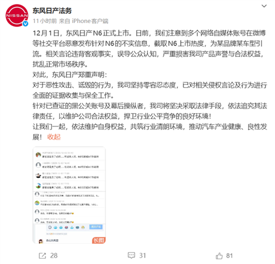 日前,我们注意到多个网络自媒体账号在微博等社交平台恶意发布针对N6的不实信息,截取N6上市热度,为某品牌某车型引流。
