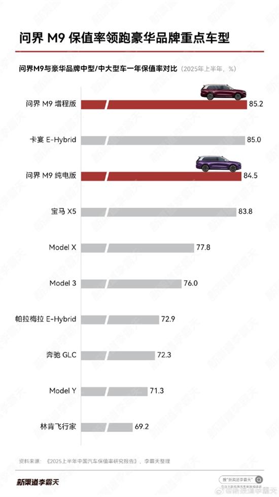 不只是销量和均价跟上了节奏,杰兰路调研显示问界净推荐值NPS(用户口碑)成绩也处于领先位置,而在豪华车大家都关心的保值率榜单上,问界M9也占据前列。