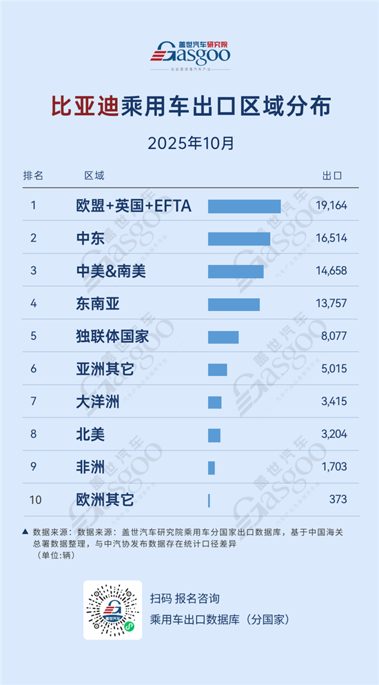 根据盖世汽车研究院出口数据库,2025年10月比亚迪乘用车出口区域排行榜如下:
