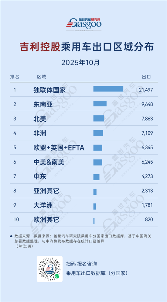 根据盖世汽车研究院出口数据库,2025年10月吉利控股乘用车出口区域排行榜如下: