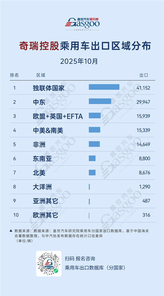 根据盖世汽车研究院出口数据库,2025年10月奇瑞控股乘用车出口区域排行榜如下: