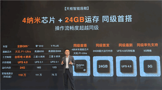 据介绍,天玑座舱P1-Ultra座舱芯片,率先采用台积电4纳米工艺制程、同级首发24GB运行内存、同级最新的UFS4.0存储规格、支持最新的LLM大模型等。
