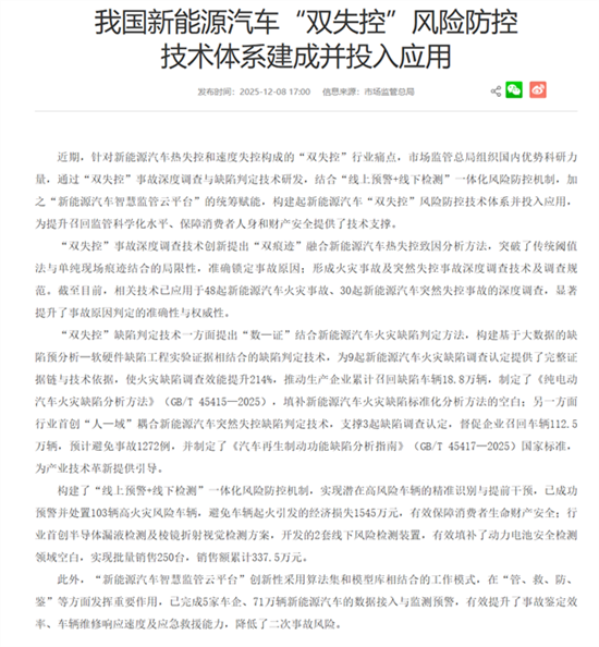 市场监管总局今日发文宣布,我国新能源汽车“双失控”风险防控技术体系建成并投入应用。