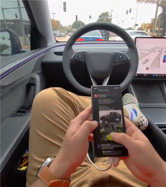 在车主使用FSD期间,他双手没有扶在方向盘上,且车机未有让他注意路况的提示,已经无限接近于自动驾驶。