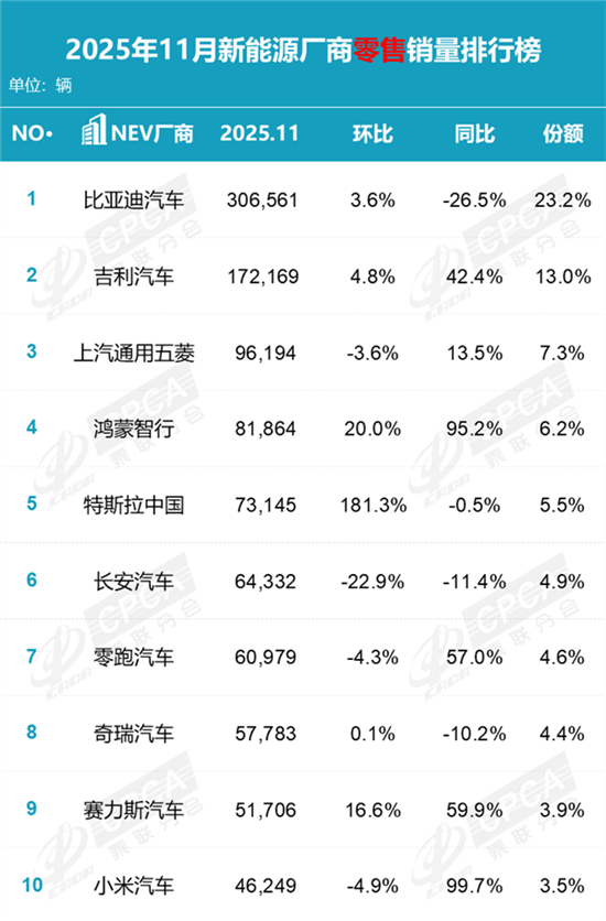 榜单的最大亮点来自排名第十的小米汽车:其11月销量达46249辆,同比暴涨99.7%,以3.5%的市场份额闯入前十阵营。