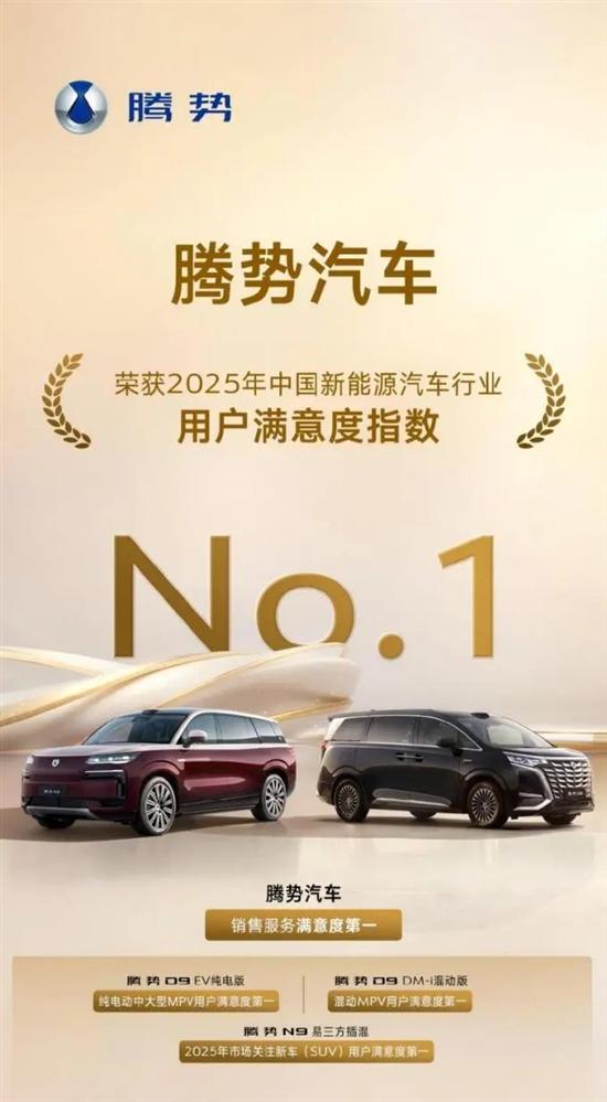 今年1-11月,腾势D9再度夺冠,持续夯实中国MPV冠军的地位。近日,在中国质量协会权威发布的2025年中国新能源汽车行业用户满意度指数(NEV-CACSI)测评中,腾势D9 DM-i、腾势D9 EV获得混动MPV、纯电动中大型MPV用户满意度第一名,这无疑是用户对其科技豪华产品力的高度认可。