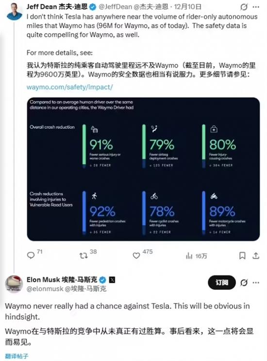谷歌DeepMind首席科学家杰夫·迪恩随即回应,指出特斯拉在纯乘客自动驾驶里程上远不及Waymo,且Waymo安全数据更具说服力。Waymo方面同步披露,其无人驾驶服务已覆盖美国10座城市,累计服务超100万人次,事故率仅为人类驾驶员的1/5。