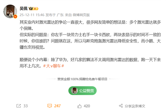 汽车博主“吴佩”日前发文称,业内对激光雷达的争论一直很大,很多网友简单的想法是:多个激光雷达就多个保障。