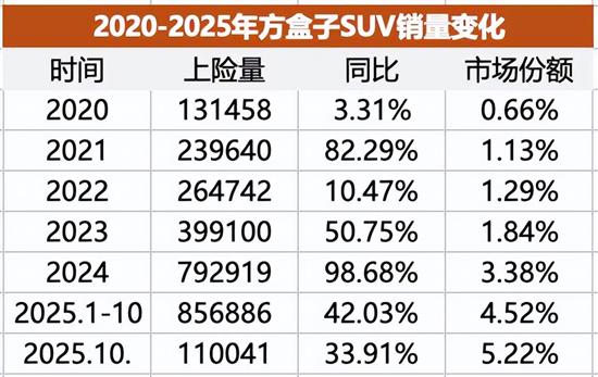 进入2025年之后,方盒子SUV市场依然在快速增长,1-10月累计销量已经超越去年全年,达到85.7万辆,10月份单月突破11万辆。按照这个趋势,今年国内方盒子SUV的全年销量大概率会突破百万辆,而其在总体市场中的份额,已经超过了5%。