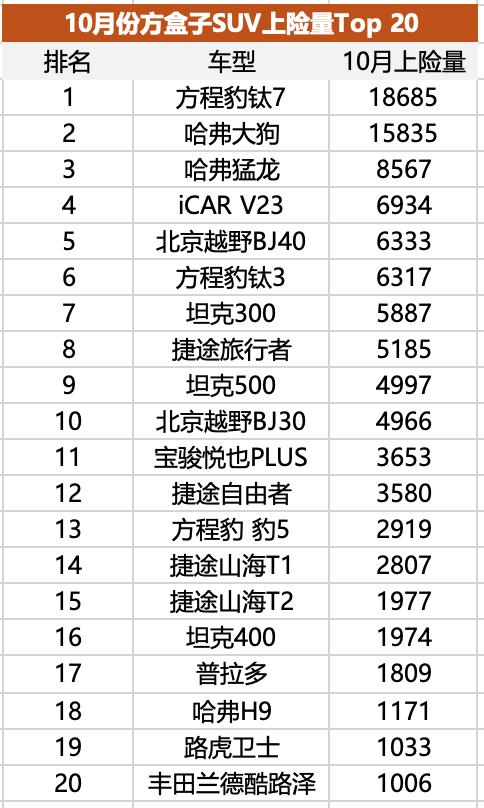 基于这个相对宽泛的标准,10月份销量排名前20的方盒子SUV,就是这些车型——