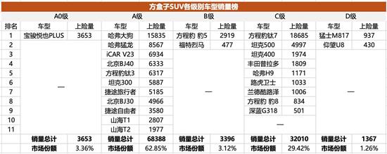 如上表,我们统计到的20多款方盒子SUV中,已经涵盖了A0级小型SUV和D级大型SUV,而不同级别车型的市场格局也有着非常鲜明的差异。