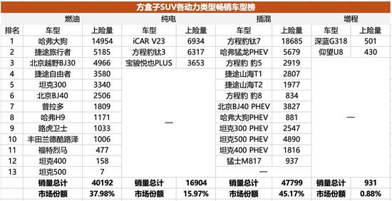 四种动力类型中,燃油和插混动力的方盒子SUV车型最多,销量占比也最高,插混的份额已经超越燃油,达到了45.17%,再加上纯电的15.97%和增程的0.88%,方盒子SUV类别中,新能源的占比达到了62%,已经超越了乘用车总体市场的新能源车渗透率。