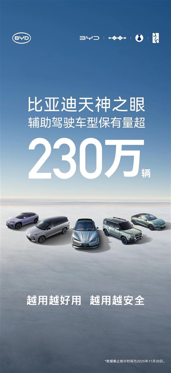 天神之眼及配套辅助驾驶车型累计销量突破230万辆,仅11月单月就售出311267辆,覆盖王朝/海洋、方程豹、腾势、仰望四大品牌矩阵。