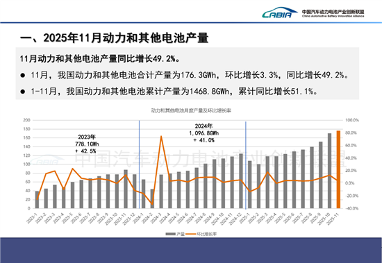 据中国汽车动力电池产业创新联盟(以下简称“电池联盟”)数据显示,1-11月我国动力和其他电池累计产量达1468.8GWh,累计销量1412.5GWh,动力电池累计装车量671.5GWh,三项核心指标累计同比增速分别达51.1%、54.7%和42%,彰显出产业强劲的发展韧性。