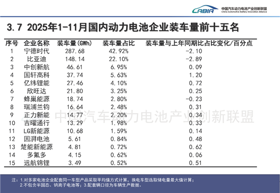 据电池联盟数据,1-11月宁德时代以287.68GWh的装车量占据42.92%的市场份额,同比下降2.1个百分点;比亚迪装车量148.14GWh,占比22.1%,同比下降2.89个百分点,“双王”合计市场份额65.02%,较去年同期减少近5个百分点,较2023年行业高位(超75%)更是大幅收缩。