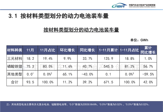 从单月数据看,11月磷酸铁锂电池装车量75.3GWh,占比80.5%,同比增长40.7%;三元电池装车量18.2GWh,占比19.4%,同比增长33.7%,两者在装车量与增速上的差距持续扩大。