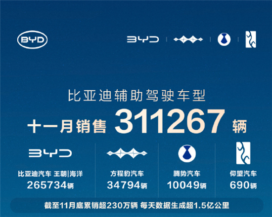 另外,比亚迪官方表示,截至11月底,天神之眼车型累销超230万辆,每天生成辅助驾驶数据突破1.5亿公里。