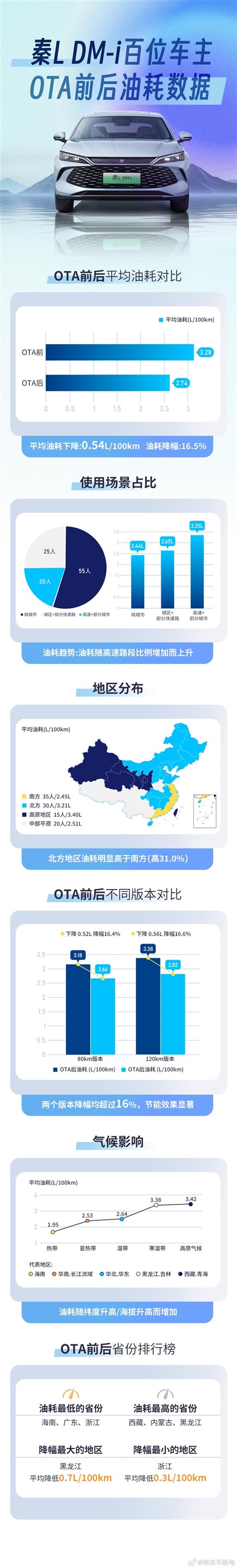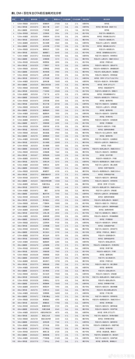 为验证OTA之后的真实油耗下降情况,博主“@ 向北不断电”征集了100位秦L的真实车主,汇集他们用车的真实油耗表现。