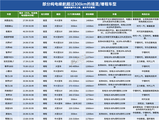 二是300-400公里区间,是高端化和技术领先的标志。例如,极氪9X高配版达380km,岚图泰山达350km,智界R7最高达360km。这个区间的车型普遍定价在30万元及以上,其续航能力已与许多纯电动入门版本持平。