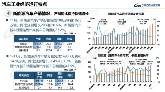 这点从销量上就可以看出。中汽协数据显示,2025年前11月,新能源汽车销量达1478万辆,同比增长31.2%。其中纯电销量951.5万辆,同比增长41.2%;插混(包含增程)销量为526.1万辆,同比增长16.4%,共同推动新能源整体渗透率无限接近50%。