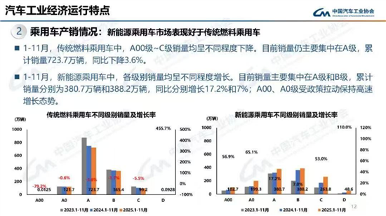 反观燃油车,1-11月销量为1634.7万辆,占比降至五成。在各细分市场——A00级-C级销量均呈现不同程度下降。
