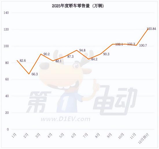 每年12月,各大车企通常会加大销售力度,总量一般相比11月提升20%左右。基于此,我们以11月零售量数据乘以1.2的系数来预测12月的零售量,预计12月中国轿车零售量约121万辆,2025年度轿车总量约1104万辆,同比增长约5.3%。