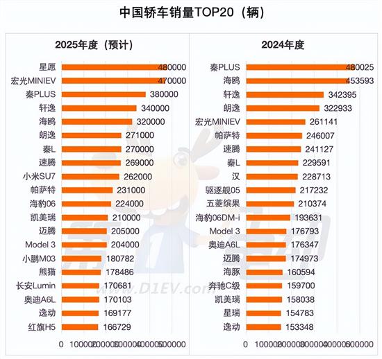 以下2025年度最畅销轿车TOP20为预估量,与明年1月中旬披露的零售量会略有出入。不当之处,请批评指正。