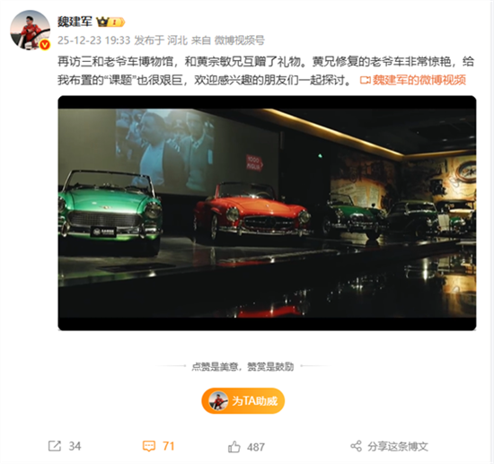 近日,长城汽车魏建军发布了一组与成都三和老爷车博物馆联动的纪录片。