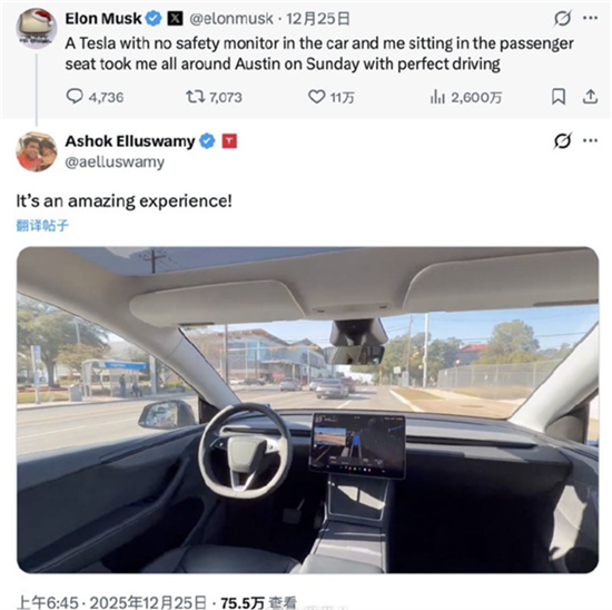 马斯克称此次试乘为“完美驾驶”,AI总监在后排发布第一视角视频,表示体验令人惊叹。