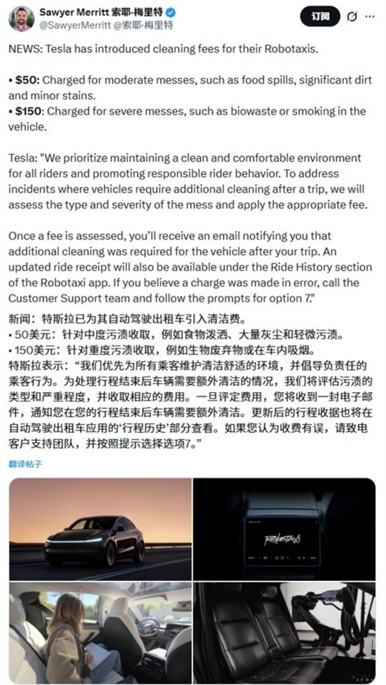 特斯拉方面表示,任何造成车辆严重污损的乘客,均需支付最高150美元的清洁费。