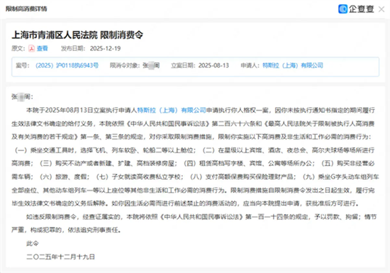直至12月,特斯拉作为申请人向法院申请限制消费,张某周因此被纳入限高名单,不得实施乘坐飞机、高铁一等座、购买不动产等高消费行为。