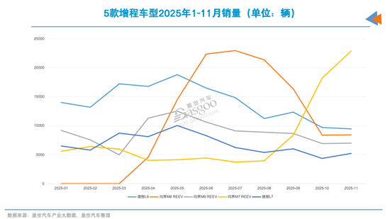 盖世汽车产业大数据显示,2025年1-11月,插电车型累计销量高达402万辆,而有销量的在售车型数量多达150余款;相比之下,增程车型累计销量为117万辆,有销量的在售车型仅50余款。再看销量榜单,1-11月销量前二十的排名中,增程车型仅占据了5个席位。